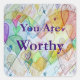 El mensaje de los pegatinas de calcomanías señala: "Eres digno". El cuadro presenta corazones superpuestos en un arcoiris de colores. Las imágenes del corazón se dibujan y pintan en acuarela. Un solo corazón grande define el borde entre el dibujo y la pintura de imágenes del corazón. El arte es un tributo a la comunidad del amor y la amistad en nuestras vidas ya que se superpone con el mundo. obra de arte Inspiradora de Laurel Latto para DonnaBellas Angels, organización sin fines de lucro. La misión de la organización es proporcionar arte inspirador para el bienestar de la salud mental. El lema es "La medicina cura el cuerpo, el arte cura el alma". Más información en línea en DonnaBellasAngels.org.