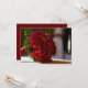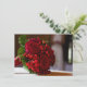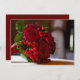 Las características del este diseño una foto de un ramo del rosa rojo y de la baya con sus troncos envolvieron en cinta roja. El ramo descansa sobre una tabla, y usted puede ver una imagen suave de una novia en el fondo. Esta tarjeta es perfecta para pedir que su amigo sea una dama de honor, un florista o una criada del honor. Personalice esta tarjeta hermosa con su propio mensaje.