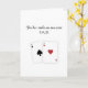 Esta es la tarjeta perfecta para el compromiso o boda de tus amigos de póquer. Dibujo: Un par de razas (as de espadas y as de corazones). Texto debajo: "Ustedes dos hacen un par impresionante" en una bonita letra de guión con "par" en un tipo de letra serif que coincide con el tipo de las cartas de juego para resaltar el juego de palabras. Interior: pala negra dibujada a mano y corazón rojo con el mensaje de su personalizado debajo en una fuente serif similar al tipo de las cartas de juego (mensaje predeterminado: "¡Felicitaciones por tu compromiso!")