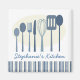 Una colección de utensilios de cocina divertidos y de estilo retro decora este imán de cocina personalizado. En tonos azules y bonitos sobre un fondo blanco. Más esquemas de color disponibles: