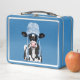 El ilustracion tiene una vaca blanca y negra que lleva un gorra de invierno azul con correas y cuerdas trenzadas. La imagen combina elementos de la vida rural con un giro humorístico, representando a la vaca en un estilo inesperado, lo que añade un encanto único a la imagen.