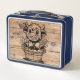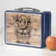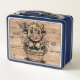 Vaca Highland sentada en un cubo en Faux Woodgrain fondo tierra en la caja de almuerzo metalizado Azul.