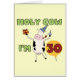 ¡El texto lee la "vaca santa que soy 30" en las trigésimas camisetas del cumpleaños, las tazas, las tarjetas, los botones, los imanes, los sellos, y otra trigésima ropa y regalos del cumpleaños con una vaca linda del dibujo animado en un gorra del fiesta que sostiene un regalo de cumpleaños y una magdalena del cumpleaños!