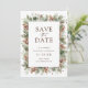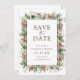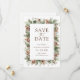 Este elegante invierno ahorra la tarjeta de anuncio de fecha con la vegetación acuática pintada a mano y pinecones dispuestos como una hermosa corona. El texto es marrón y el fondo es blanco. La parte trasera incluye un elegante ramo. Buscar elementos coincidentes en la colección Navidades de Pinecone y Greenery Holiday.