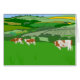Ilustracion de tres vacas marrones y blancas pastoreando en un campo verde con vistas a los prados y al campo a lo lejos. Imagen disponible en varios regalos y productos.