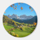 Imán fotográfico redondo de recuerdo con la localidad de St. Magdalena o Santa Maddalena con la iglesia característica frente a las cumbres montañosas de Geisler o Odle Dolomitas en el valle Val di Funes (Villnoesstal) en Italia en otoño rodeado de hojas de otoño.