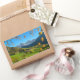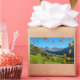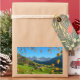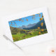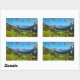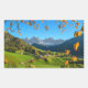 Pegatina fotográfico rectangular de la localidad de St. Magdalena o Santa Maddalena con la iglesia característica frente a los picos montañosos de Geisler o Odle Dolomitas en el valle Val di Funes (Villnoesstal) en Italia en otoño rodeado de hojas de otoño.
