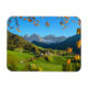 Imán fotográfico rectangular con el pueblo de Santa Magdalena o Santa Maddalena, con la iglesia característica frente a las cumbres montañosas de Geisler o Odle Dolomitas en el valle Val di Funes (Villnoesstal) en Italia en otoño rodeado de hojas de otoño.