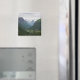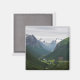 Imán fotográfico de recuerdo de un paisaje con un camino curvado en el verde valle de Hjelle rodeado de altas montañas en Noruega.