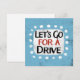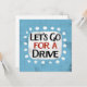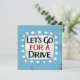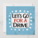 "Let's Go For A Drive" es un bonito diseño de texto en azul claro con texto en negro y rojo, con una forma de acento blanco y puntos caprichosos de textura blanca que lo rodean.