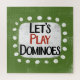 "Let's Play Dominoes" es un lindo diseño de texto con una forma de acento blanco rodeado de puntos caprichosos de textura blanca.