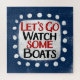 "Let's Go Watch Boats" es un lindo diseño de texto en azul marino con texto en negro y rojo, junto con una forma de acento blanco y puntos caprichosos de textura blanca que lo rodean.