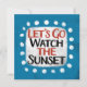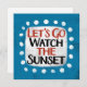 "Let's Go Watch The Sunset" es un lindo diseño de texto en azul claro con texto en negro y rojo, junto con una forma de acento blanco y puntos caprichosos de textura blanca que lo rodean.