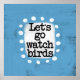 Un lindo diseño tipográfico de observación de aves que dice "Vamos a ver aves". Es texto negro sobre un rectángulo blanco con puntos divertidos y juguetones alrededor de él, todo sobre un fondo azul claro.