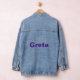 Greta Denim Jacket Esta es una gran chaqueta de Denim para mujeres. La parte trasera de la chaqueta de denim muestra el nombre de una mujer Greta en texto morado. ¡Esta chaqueta de personalizado de mujer es tu declaración personal de moda! La chaqueta de denim le permite a la gente saber que alguien con el nombre en la espalda está usando esa chaqueta. Personalízalo con tu imagen o diseño favorito y ostenta tu estilo único a donde vayas. Puede cambiar el nombre haciendo clic en el vínculo Personalizar. Muestra tu individualidad, con esta chaqueta de jean de mezcla de algodón. Puede pagar esta chaqueta con 4 pagos sin intereses con Klarna. También puede obtener un descuento para estudiantes. El modelo tiene 6' de alto y lleva un pequeño. Revise la tabla de tamaño para asegurarse de que la longitud del manguito de ajuste es adecuada. El tejido es 90% algodón, 6% poliéster, 3% Rayon y 1% Spandex. Las instrucciones para el cuidado son Lavado de Máquina Frío, No Bleach, Llano Seco y Baja Hierro.