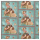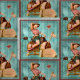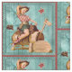 Esto es una vaquera del vintage que se sienta en un caballo de madera. He substituido el fondo original por un fondo de madera apenado de la cerca de la turquesa. Hay también 2 pequeñas fronteras alrededor de los bordes.