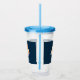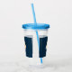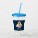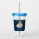 Un tumbler acrílico con una linda pintura acuarela de un león madre sosteniendo su cachorro de bebé. Un ramo de flores moradas de bonito debajo de ellas aporta un toque agradable a esta imagen dulce y adorable. Fondo azul oscuro.