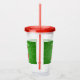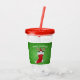 Este vaso acrílico con gota y tapa tiene un lindo gnomo con un gorra rojo puntiagudo dentro de un Navidad lleno de hojas huecas y dos bastones sobre un fondo verde con remolinos. Personalizar el texto de Feliz Navidad con la plantilla.