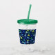 Los niños del dinosaurio de la acuarela personalizaron el vaso del acrílico del modelo de Dino. Añada el nombre en frente en fuente azul. Corrija para cambiar color o estilo de la fuente. Modelo del abrigo de los dinosaurios alrededor de la taza en fondo azul. www.SamAnnDesigns.com