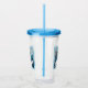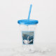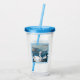 Esta bebida acrílica, con gota de paja y tapa, tiene un cisne madre blanca bonito nadando en un lago azul rodeado de árboles con su bebé en una orilla azul claro ornamental en la parte delantera y trasera.