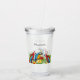 Aves tropicales, loros en azul, amarillo y rojo sentados sobre hojas de palma verdes. Decorado con flores tropicales. Plantilla para un nombre, script de estilo con letras de mano negra. Perfecto para un fiesta de piscina o fiestas de verano con niños Utilice su tecla de retroceso para borrar si desea el vaso sin texto o nombre.