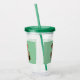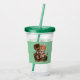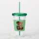 Esta bebida acrílica con gota y tapa tiene una divertida pareja de gatos. La hembra rayada amarilla comparte sus ratas de su canasta de madera con el gato macho marrón sobre un fondo verde menta.
