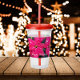 Tome su bebida fría favorita en este tumbler moderno y acrílico con tapa y paja para beber que muestra la imagen fotográfica de Poinsettias rojas y variadas, también conocida como la flor de los Navidades. La imagen está impresa en dos lados. Un bonito diseño floral para las vacaciones.