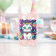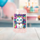 Vidrio adorable con un lindo gatito personalizado blanco con ojos azules grandes, orejas rosas y un collarín colorido y brillante. Tiene una linda cola de rayas azules, rosas y blancas y una franja azul en la cabeza. El fondo es principalmente morado, con planetas, nubes, estrellas y flores en una mezcla de colores vivos, vivos y audaces. Ideal para todo aquel que ame los gatos y el espacio.
