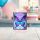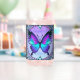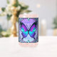 Una mariposa vibrante con tonos azules y violetas se centra en un diseño circular ornamentado, rodeado de intrincados motivos florales y joyas decorativas. La composición general se caracteriza por una estética de vidrio manchado con una mezcla armoniosa de colores y simetría.