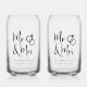 El personalizado puede armar un juego de vidrio para recién casados con "Mr & Mrs." en un gran y elegante guión y un ilustracion de dos anillos de boda juntos. Añada los nombres de la novia y del novio y la fecha del boda.
