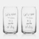 A clear glass with Let's raise our glasses to a new day of joy, an uplifting message for your next fun loving gathering.
