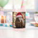 Esta imagen muestra la calidez festiva de un wombat con un sombrero de Papá Noel, situado junto a un árbol de Navidad y regalos con un fondo mágico de bokeh.