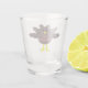 Este impresionante cristal de disparo presenta un personalizado de un pavo con grandes ojos negros, un pequeño pico amarillo y plumas de cola pegadas. Los pies están en direcciones opuestas, lo que hace que el pavo parezca ridículo. El pavo tiene un texto rosado en el vientre que dice "Feliz Día de Acción de Gracias" y parece que las plumas han sido arrancadas para revelar el mensaje.
