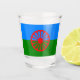 Este diseño cuenta con la bandera romaní, que es la bandera internacional del pueblo romaní. La bandera consiste en un fondo azul y verde que representa el cielo y la tierra, respectivamente; también contiene una chakra roja de 16 radios, o volante, en el centro, que representa la tradición itinerante del pueblo romaní y también es un homenaje a la bandera de la India. La bandera fue aprobada por los representantes de varias comunidades romaníes en el primer Congreso Mundial Romaní (WRC), celebrado en Orpington en 1971.