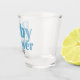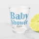 Esta divertida y aguda copa muestra la frase "Baby Shower" impresa en un estilo retro, falso tipo de letra purpurina azul bebé. La palabra "shots" se imprime debajo en un tipo de letra negro delineado.