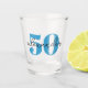 Vaso de chupito de cumpleaños 50 personalizado con texto de edad en azul y nombre en letra script moderna. Los colores y fuentes se pueden cambiar si es necesario