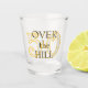 Vaso de chupito Sobre la colina. Incluya su edad detrás del texto "sobre la colina". Texto es marrón oscuro-negro con sombra naranja. Los números son gris claro delineados en amarillo-naranja.