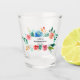 Vaso de chupito de despedida de soltera rosa con flores de acuarela rosadas, rojas, azules y hojas verdes.