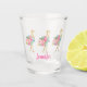 Este vaso de chupito lindo presenta tres flamencos de oro tropicales con flores rosas y verdes. Personalice con su elección de nombre o texto especial. Divertido para fiestas de soltera y despedidas de soltera.