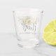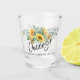 Vaso de chupito de celebración con girasoles de acuarela, eucalipto y vegetación que dice ¡Salud! en letra script.