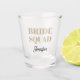 A great barware gift for the wedding bridesmaid squad attending a bachelorette party! Shot glass features modern style lettering with the words "Bride Squad" printed in a trendy khaki color along with bridesmaid's name printed in black, stylized script. Select from many, popular bridal party color schemes. Personalize your shot glass by editing and replacing bridesmaid's name.