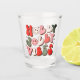Los Navidades retro Holly Jolly Vibes Trendy Holidays Shot Glasses presenta el texto "Holly Jolly Vibes" en un guión retro en rojo, verde y rosa acentuado con estrellas y caras adorables y felices. Diseñado por ©Evco Holidays www.zazzle.com/store/evcoholidays