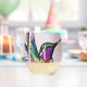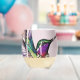 A brushstroke-style design featuring a vibrant hummingbird adorned with a spotted bow tie, its wings fluttering as it hovers gracefully above a nest fille