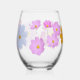 Stemless wine glass featuring cosmos flowers in pink, white, and orange.