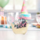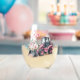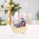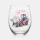 Una divertida copa de vino con un refrescante digger de bobcat rosado en la playa llevando un cubo lleno de flores, los puntos acentúan el fondo. Añade un mensaje como "Te cago" para un dulce sentido del humor.
