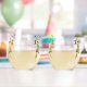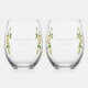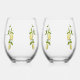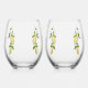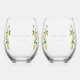 These custom wineglasses features fresh citrus illustrations of lemons on a branch and are ready to be personalized with the name of the bride and groom and their wedding date. The text and graphics appear on both sides of each glass.