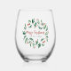 Hermosas hojas de color agua verde con bayas rojas y azulejos adornan estas lindas gafas de vino Feliz Navidad para tu fiesta navideño. Personaliza el guión de festividad roja con tu apellido en el centro de este magnífico patrón botánico.