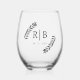 Celebra tu amor con esta elegante copa de vino sin tallo, con tu nombre monogramas o iniciales, y fecha de evento en un clásico guión de caligrafía negra de moda y decoración de hojas de laurel botánico. Esta bodega personalizada es perfecta para fiestas de novias o solteras, bodas, aniversarios o cualquier ocasión especial. Brinde su felicidad a sus invitados con este hermoso y único regalo de fiesta que hará que sus recuerdos duren para siempre.