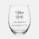Esta copa de vino se muestra con una impresión de Madre de la Novia en una boda con nombres y fecha personalizados de muestra, así que personaliza y cambia el texto de muestra al tuyo con esta plantilla.