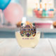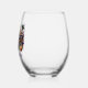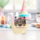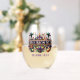 This wine glass is shown in a festive Mardi Gras bourbon street print.
